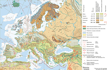 Bacino di Parigi, Bacino Pannonico, Banca di Porcupine, Catena Caledonica, Catena Variscica, Cordigliera Betica, Depressione Caspica, Depressione del Pečora, Depressione di Kostroma, Depressione Moesiana, Dorsale diReykjanes, Ex-Tetide, Faglia Anatolica, Faglia di Great Glen, Faglia di Jan Mayen, Fennosarmazia, Fossa Centrale, Fossa del Dnipro e del Donec, Fossa di Malta, Fossa di Oslo, Fossa di Pacelma, Fossa di Rodano, Fossa di Viking, Fossa renana, Gondwana, Linea di Tornquist e Teisseyre, Massa Boema, Monti del Ponto, Monti Rodopi, Platea di Rockall, Platea di Vøring, Scudo baltico, Scudo Ucraino, Tavolato Arabo, Tavolato Russo, Tavolato Siberiano